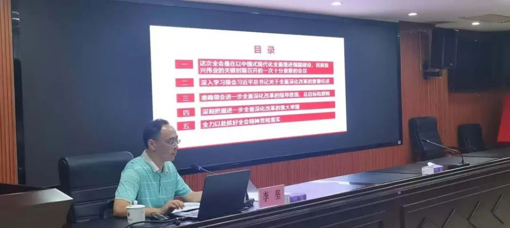 李坚从“全会的重大意义和深远影响;深入学习领会习近平总书记关于全面深化改革的重要论述;准确领会进一步全面深化改革的指导思想、总目标和原则;深刻把握进一步全面深化改革的重大举措;全力以赴抓好全会精神贯彻落实”等五个方面,对全会精神作了全面宣讲和深入阐释。