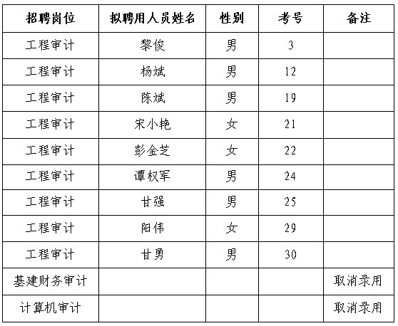 根据《株洲市审计局2021年招聘投资审计专业技术人员公告》及有关规定,经报名、资格审查、考试、体检与考察等程序,经研究,确定下列同志为拟聘用人员(编外合同制),现予以公示。